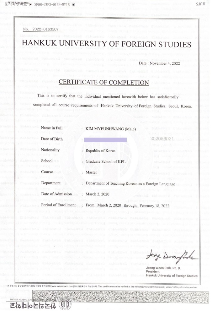 한국외국어대학교 대학원 외국어로서의 한국어교육학과 수료